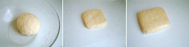 Knead until smooth, then shape a square and wrap in plastic film... Place in the fridge for 2 hours...